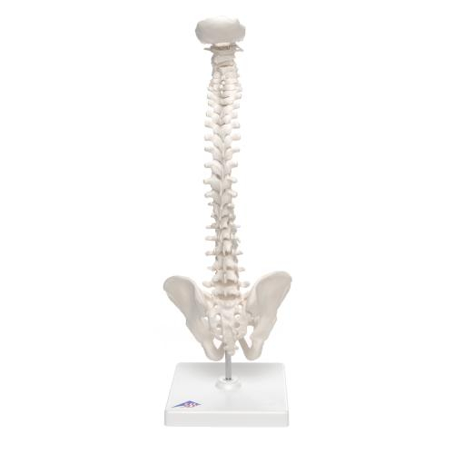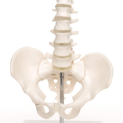 Vertebral spine model with squama occipitalis and pelvis. The vertebral column is mounted flexibly to demonstrate natural movements and pathological changes in the human spine. The spine model is on a detachable stand.