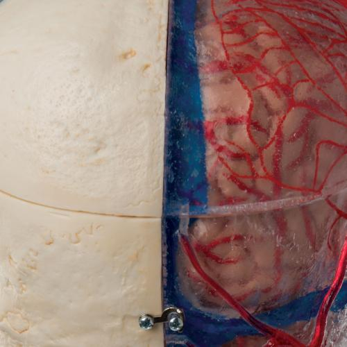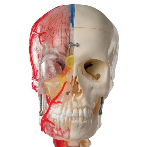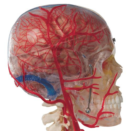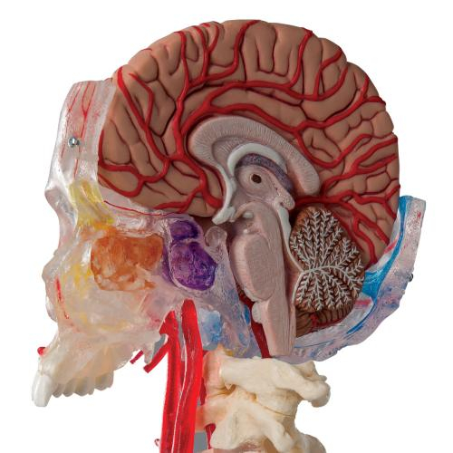 The cranial sinuses and the neck and face arteries are also shown in color: sinuses of dura mater (blue), common carotid artery, external and internal carotid artery and the branches of the meningeal artery (red). One brain half, which is also visible through the skullcap, visualizes the brain position and the course of the sinuses. The periodontal pockets and tooth roots can be viewed through the transparent jaw of the skull. The lower jaw is mounted flexibly to demonstrate the masticator movements of the human skull. The didactic skull is mounted on a cervical spine and can be disassembled into both halves of the skullcap, the left half of the base of skull, the nasal septum, the complete mandible and a brain half.
