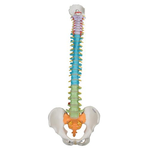The 5 different sections of the spinal column are differentiated by color on this human spine model. The features on this didactic flexible spine are: