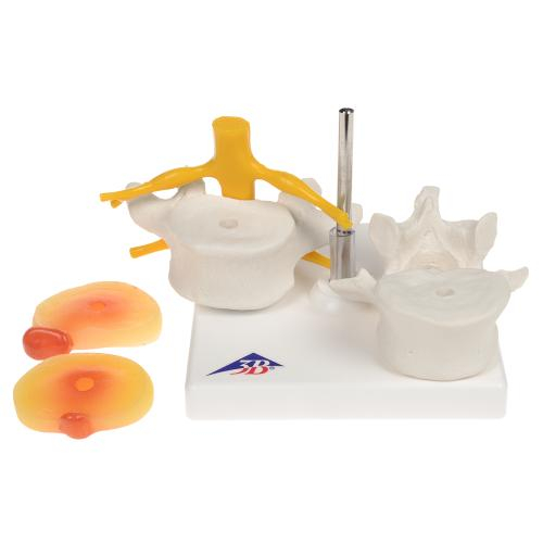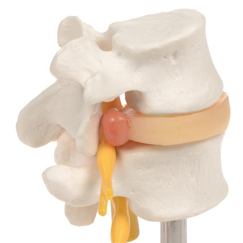This realistic model details 2 lumbar vertebrae with spinal nerves, dura mater of spinal cord. The anatomy model includes 2 replaceable dorso-lateral prolapsed discs between the 4th and 5th lumbar vertebrae.