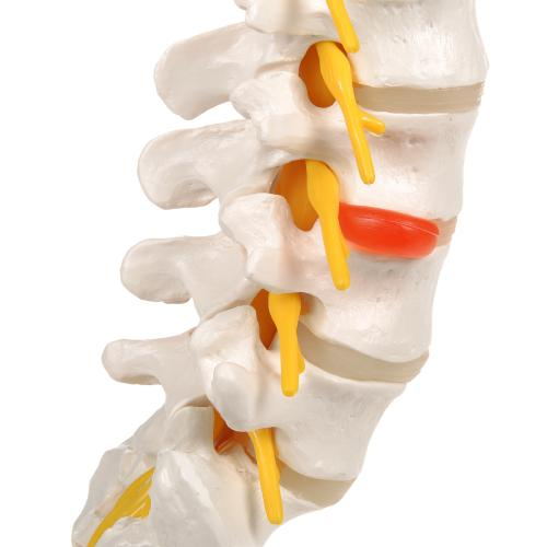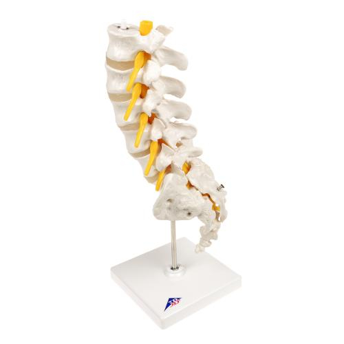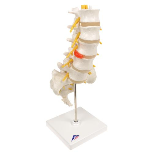 The lumbar model includes a prolapsed intervertebral disc between the 3rd and 4th lumbar vertebrae.