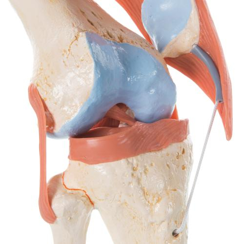 This high-quality deluxe functional knee joint model with ligaments shows the anatomy and possible physiological movements of the human knee joint in exceptional detail. This model clearly demonstrates abductions, anteversion, retroversion, internal and external rotation. This knee joint model also clearly defines the ACL and PCL. The color of the natural-cast bones of the knee joint is extremely realistic. The cartilage on the knee joint surfaces is marked blue. This model consists of portions of the femur, tibia and fibula, menisci and patella. The Functional Knee joint model is mounted on a base for easy display.