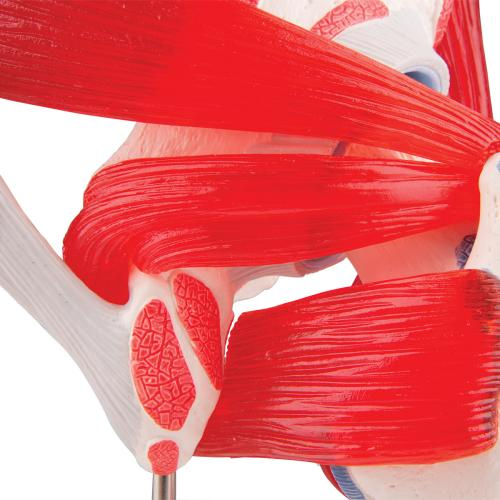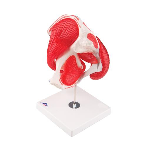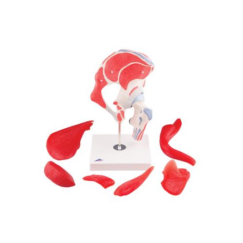 Represented here is the right hip joint of a male with the individual muscles as well as the muscle origins and insertions on the femur and the hip bone. For educational purposes, the origin and insertion areas of the muscles have been raised and presented in color (muscle origin = red; muscle insertion = blue) on the hip joint. The hip muscles have been mounted on their corresponding regions of origin and insertion and are removable from the hip joint for a different perspective. Studying the anatomy of the human hip bone is easy with this hip joint and removable muscle. The relationship of the muscular system and skeletal system are represented clearly with this human hip joint model.