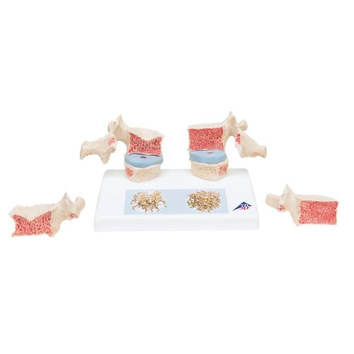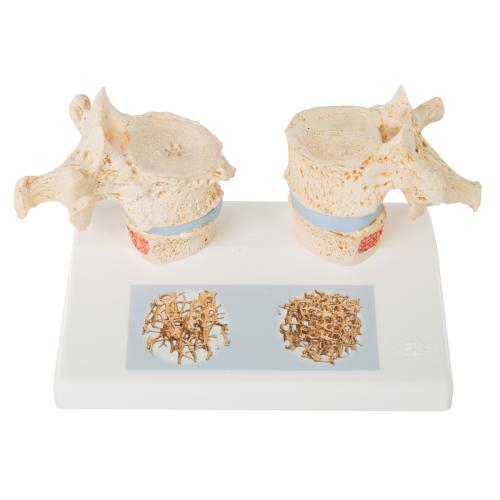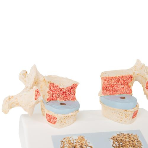 Impressive didactic model for comparing osteoporotic and normal thoracic vertebrae. Ideal for medical studies and patient consultation. The 11th and 12th thoracic vertebrae are shown.