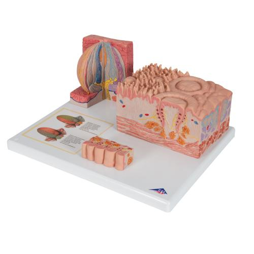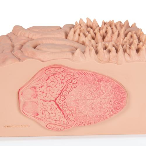 The latest model in3B MICROanatomy series, the tongue, is fascinating in that it combines various enlargements of specific parts of the tongue in one model. It comprises a macroscopic view of the tongue in life size (dorsal view) and microscopic views of the various papillae of the tongue (10-20x life size) and of a taste bud (approx. 450x life size). All views are mounted on a base that also features and overview of the sensory and sensitive innervation of the tongue. A unique model for and intensive study of the tongue.