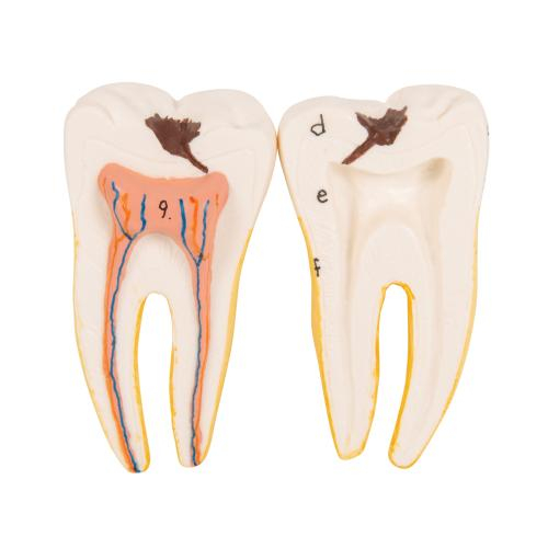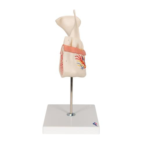 The model represents half of the left lower jaw of a young person. One section of bone is removable from the half lower jaw to expose the tooth roots, spongiosa, vessels and nerves. Canine and first molar are removable from the half lower jaw, and longitudinally sectioned. Half lower jaw on stand.