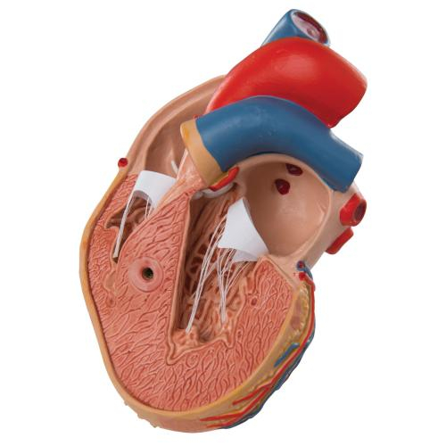 This unique heart model shows the long-term effects of increased heart activity due to high blood pressure. The muscular wall of the left heart ventricle is considerably thickened and the tip of the heart is visibly rounded off. Highly detailed 2-part heart at a price you will love. The front heart wall is detachable to reveal the chambers and valves inside. The heart is just slightly smaller than life-size with exquisite anatomical detail throughout. Heart on removable stand.