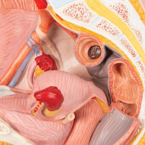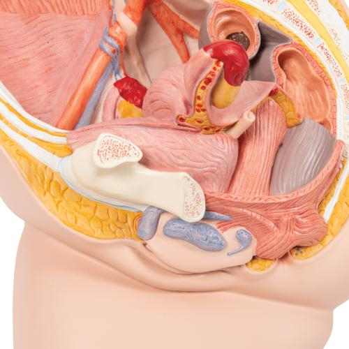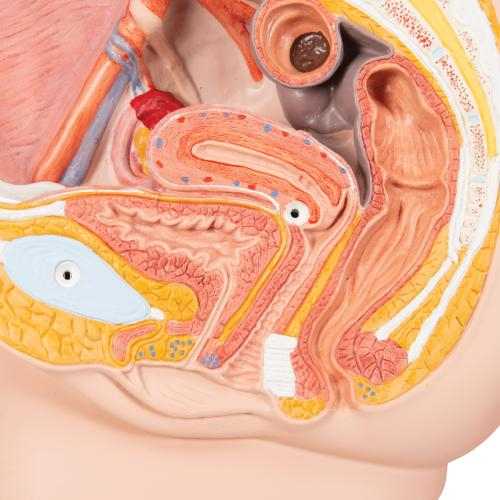 This female pelvis is in median section. This female anatomy model shows one half of the female genital organs with bladder and removable rectum. The female pelvis is delivered on baseboard offering the possibility to be mounted to the wall for easy display in the classroom or doctor's office. This model is high quality and shows the female pelvis in anatomical detail.