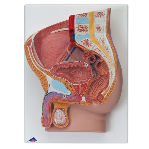 The male pelvis anatomy model is shown in median section. One half of male genital organs with bladder is shown at the normal position in the male pelvis. The rectum is removable for a more detailed study of the male pelvic anatomy. This high quality anatomy model is delivered on baseboard offering the possibility to be mounted to the wall.