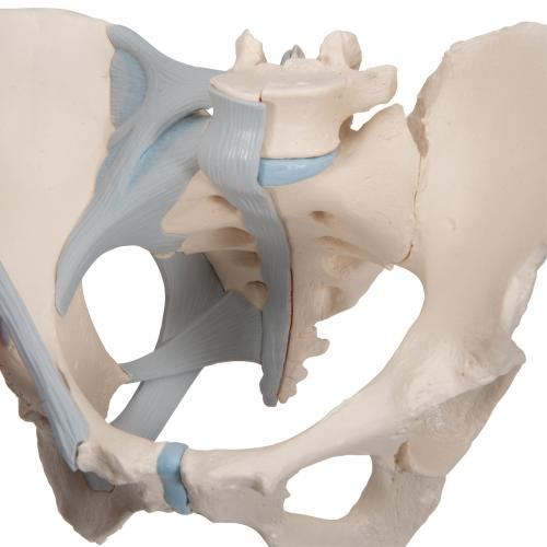 This life size three part model represents and original cast of a bony female pelvis with ligaments and shows all the details of the following anatomical structures: