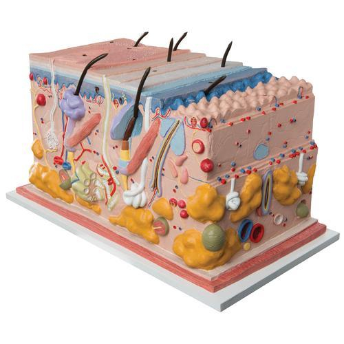 This unique skin model shows a section of human skin in three dimensional form. Individual skin layers are differentiated, and important structures of the skin such as hair, sebaceous and sweat glands, receptors, nerves and vessels are shown in detail. The high quality skin block model is mounted on baseboard. Demonstrating the anatomy of the human skin has never been easier! This skin block model details the human skin in 70 Times life size.