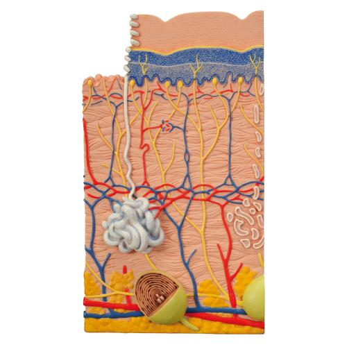 All layers of the skin (epidermis, dermis, and subcutis) and microscopic structures such as nerves, vessels and tactile corpuscles are shown in and anatomically accurate representation.