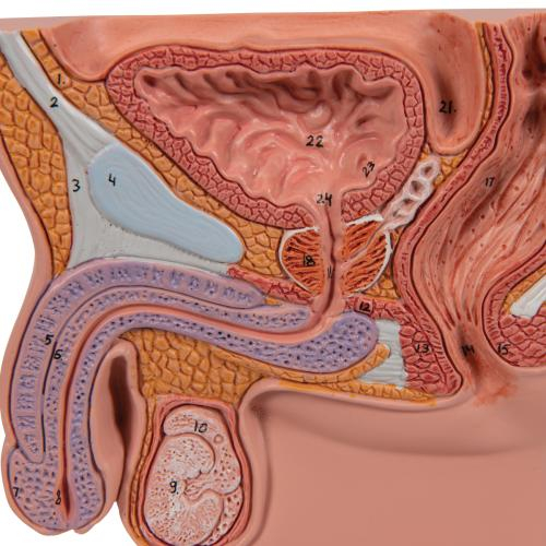 This prostate model provides a cross section of the male genital organs showing a healthy prostate with bladder, urethra, testicle, symphysis and rectum. The narrowing of the urethra due to the change of the prostate is made clear via the 4 cross sectional views on the bass of the prostate model. The anatomical structures of the prostate model have simple schematic coloring. Prostate model on base.