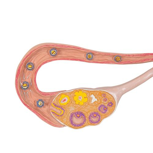 The model illustrates schematically how the ovum matures, how ovulation and fertilization occur and how the fertilized ovum develops to the stage where it embeds itself in the womb wall to begin the growth into and embryo.