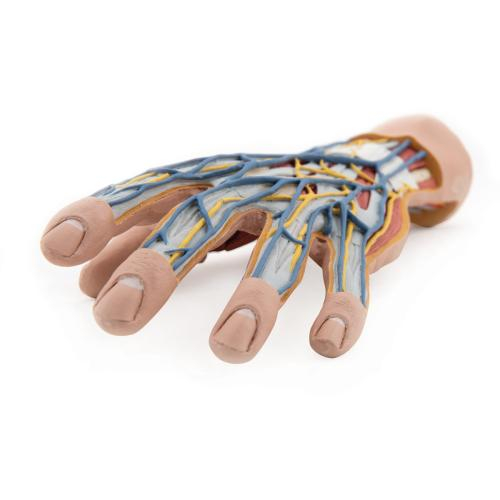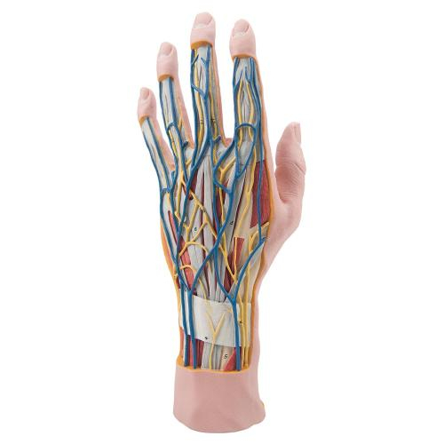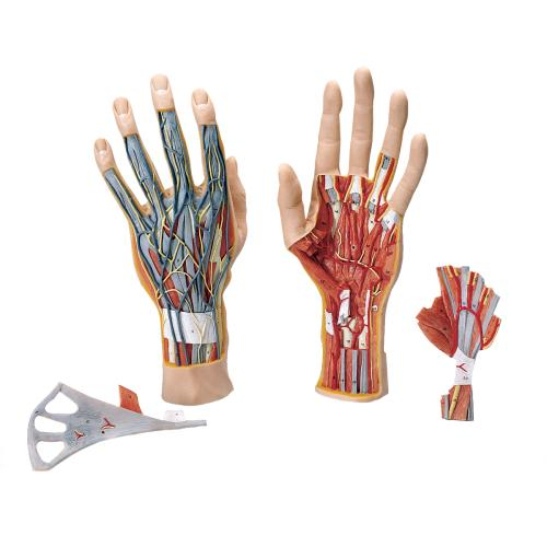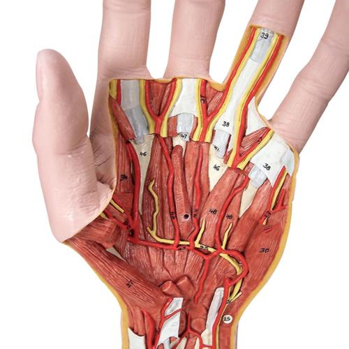 This life size hand model shows the superficial and internal structures of the human hand, including bones, muscles, tendons, ligaments, nerves, and arteries (superficial and deep palmar arches). The palmar aponeurosis and plate of the superficial tendons are removable from this high quality hand model. This hand is great for study of the anatomy of the human hand.