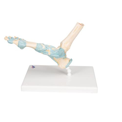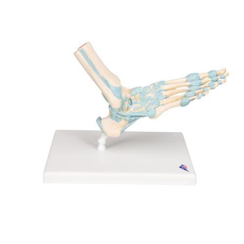 This detailed foot skeleton model displays numerous important ligaments and tendons including the Achilles and peroneus longus tendons of the ankle. The foot skeleton consists of the foot bone and lower portions of the tibia and fibula, including the interosseous membrane found between them. All the anatomically important ligaments and tendons of the foot are shown, large and small. This is a high quality anatomical replica of the human foot and ankle.