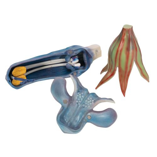 At 15 Times magnification, the model shows the detailed structure of a single flower with its pollination mechanism. For further illustration, the model separates into four components. The typical lever mechanism for picking up pollen which then sticks to the bodies of insects can also be demonstrated.