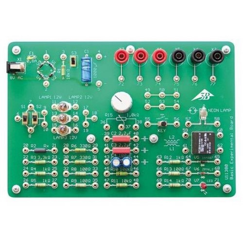 Experiment board with basic circuits for electricity and electronics: circuit components, Ohm's law, Kirchhoff's laws, rheostat and potentiometer circuits, two way switching, charging and discharging curves of a capacitor, inductive effects in DC and AC circuits. Simple semiconductor circuits for determining diode characteristics, rectifier circuits, filter factors. The components can be interconnected via 2 mm sockets using jumpers and experiment leads. Six 2 mm /4 mm safety socket adapters are provided for connecting 4 mm experiment leads. Voltage limitation to 25 V AC and 60 V DC.