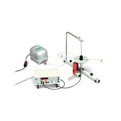 Apparatus for investigating frictionless rotation. A small rotating disc with a protractor scale supports a cross bar to which weights can be attached. The disc is supported by a bed of air in which its axis is centred. A driving weight is suspended from a hook at the end of a string that is passed over a single pulley on one side and a multiple pulley on the other. The rotation is very slow and can be measured using a stopwatch by hand. Alternatively, a digital timer may be used. This can be started by a mechanism that is supplied with the kit and halted by a signal from a laser reflection sensor when the wheel passes through angle zero.
