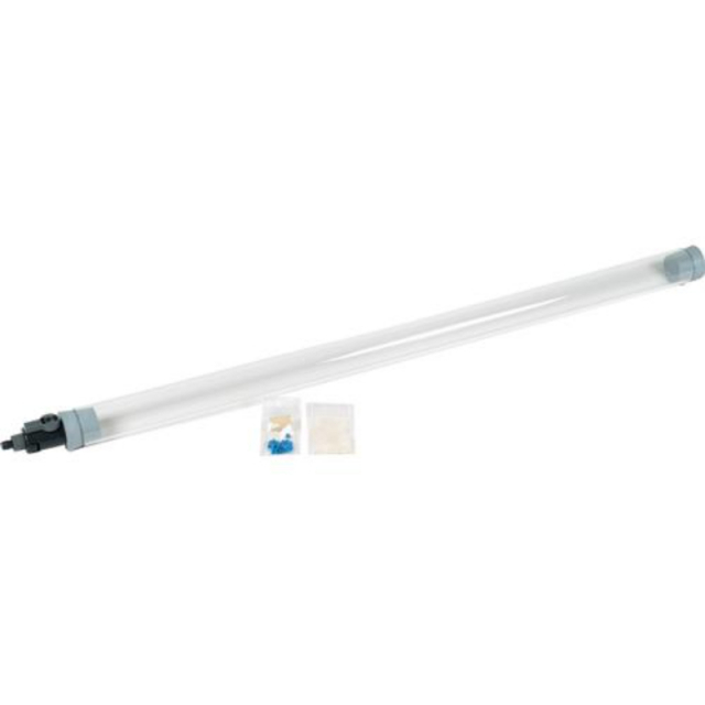 This glass tube can be evacuated to compare the free-falling characteristics of different objects in a vacuum. Duck feathers and plastic parts are included as falling objects.