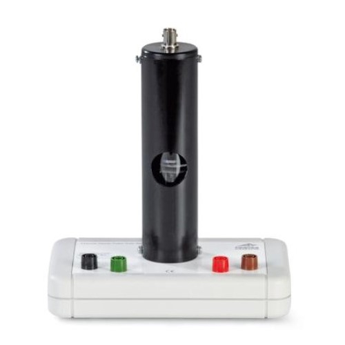 Highly evacuated electron tube containing neon, mounted on a base with socket connection for demonstrating that free electrons colliding with neon atoms emit energy in quantized packets and for determining the excitation energy of the 3P0 or 3S1 states at about 19 eV. When excited, these states emit visible light due to the energy drop from intermediate levels to a ground state at an excitation energy of about 16.7 eV. The light so emitted is in the red-yellow region of the spectrum. Parallel bands of light are formed between the control grid and the accelerator grid and can be observed through a window. The Franck-Hertz neon tube can be operated at room temperature. Tetrode with indirectly heated cathode, mesh control grid, mesh accelerating grid and collector (counter) electrode. Mounted on a base with colour coded connection sockets.