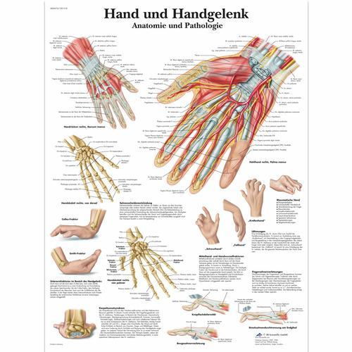 This anatomical chart depicts the anatomy and pathology of the hand and wrist in bright colors. The poster presents the wrist in anatomical detail while reviewing some pathologies that can affect the area. This thickly laminated anatomical chart is printed on premium glossy (200 g) UV resistant paper and comes with 2 sided lamination (75 micron). It comes in a convenient poster size 50 x 67 cm (20 x 26") and can be written on and wiped off with non permanent markers. The 75 micron lamination ensures the chart does not curl up at the edges and the UV treatment ensures the chart does not get a faded yellow color over time. Language: German