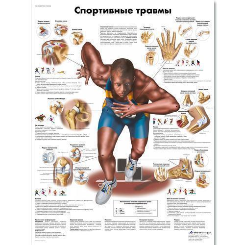 This colorful anatomical chart displays several injuries common to sports. The anatomy of the injuries are shown and useful information is presented on this quality anatomy poster.