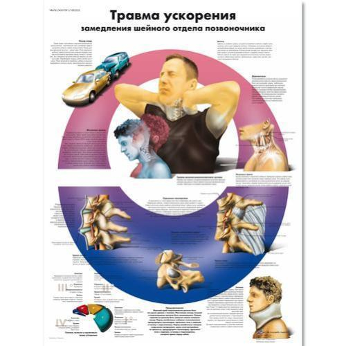Whiplash and other acceleration spinal injuries are described in this colorful poster. The anatomy of injury to the spine as well as symptoms and treatment for injury are presented in this anatomical poster.