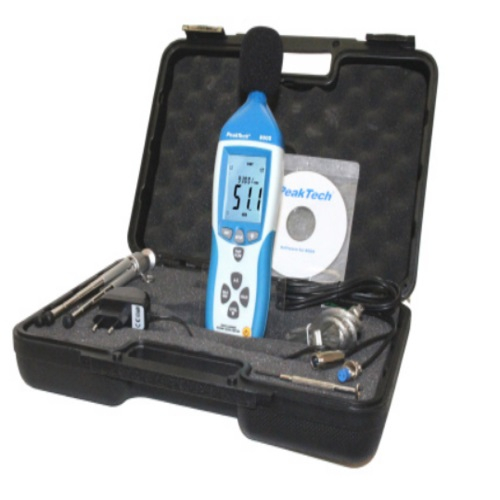 Digital noise level meter with circuit for suppressing background noise for measuring all types of sound levels in the environment, including noise levels in schools, offices, factories, traffic noise, household noise or for noise-reduction projects. Allows for manual or automatic selection of levels and measurements of minimum and maximum levels. Thanks to its built in USB port, the supplied 9 V mains adapter and stand, it is also suitable for permanent or long term measurement.