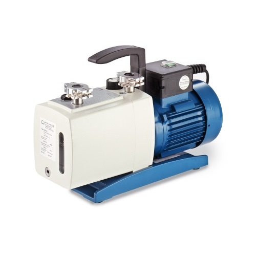 Rotary-Vane Vacuum Pump, P 4 Z. Compact, two-stage rotary pump with high suction capacity. Automatic lubrication of the rotary valve and ball bearings using optimised oil pressure increases the final pressure levels achievable, stabilises the pump temperature and Prolongs the pump's working life. Includes direct drive with elastic coupling. Device exhibits good resistance to chemicals and a high degree of water vapour compatibility. A suitable mechanism prevents the oil from rising back to contaminate the recipient. Lightweight device that operates with low noise. High-quality parts make the device capable of continuous operation. The pump is complete and ready for connection with a full complement of oil, centring ring, locking ring, motor Protection circuit breaker, mains switch and connection cable with mains plug