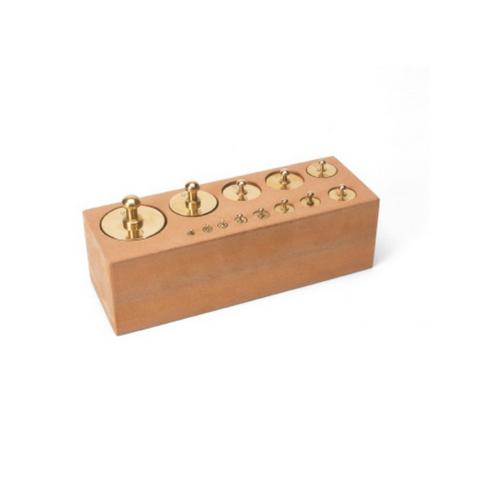 13 brass weights in storage block.1 x 1 g, 2 x 2 g, 1 x 5 g, 1 x 10 g, 2 x 20 g, 1 x 50 g, 1 x 100 g, 2 x 200 g, 1 x 500 g, 1 x 1000 g