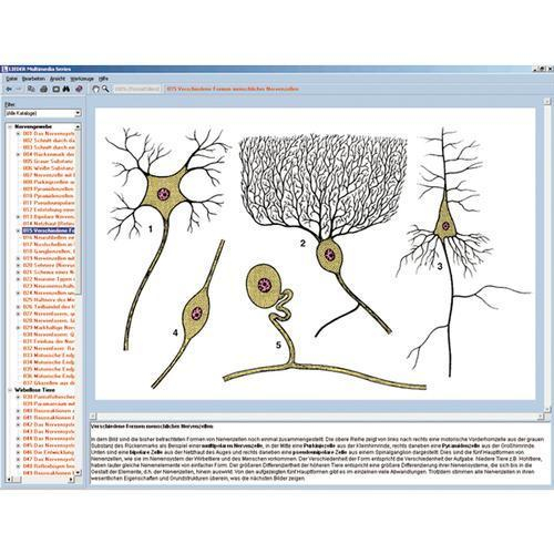 Introductory CD for the nervous system. View of the entire human nervous system. Occurrence of the typical nerve cells in the human nervous system. Fine structure of a neuron, composition of the nerve, motor end plates, glial cells, nerve cells and nerve tissue. Neuron, ganglion, centers, reflex arcs, automatism. Embryonic development of the human nervous system. Neural plate, neural groove, formation and closure of the neural tube. Description of the development of different nervous systems of invertebrates and vertebrates facilitates understanding of the human nervous system. Formation of the neopallium from . Concentric growth rings. Phylogenetic tree of mammalian brain convolutions. Connection between brain sensory and motor nerves and various body areas. Development of the thalamus into a relay station. Progressive . Concentration and differentiation in the brain, component parts and their relation to each other. Increase in organizational complexity.