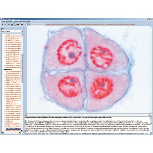 A fundamental feature of all living creatures is that their organism grows. The actual growth of multicellular organisms results from the increase in the number of cells. Cell divisions make it possible for a single fertilized egg cell to give rise to millions and billions of cells. In the process, chromatin, as carrier of hereditary information, is duplicated, then halved in a highly accurate manner and then transferred to both daughter cells. The complex process of meiosis, the reduction division. Through meiosis not only is the number of chromosomes halved, but also the utterly Important rearrangement of chromosome sets and the exchange of segments ("crossing over" process) both take place. The process of cell division is explained through classical examples of known animals and plants. Fine structure of the cell and its nucleus. The sequence of a normal cell division (mitosis) in chronological steps. Resting nucleus. Contraction, division and separation of the daughter chromosomes. Recombination of hereditary traits and reduction in the number of chromosomes through meiosis. Primordial sex cells. Entering of a sperm in the egg cell (ovum). Prophase, first and second meiosis. Dismissal of the sperm's flagellum (tail). Mixing of male and female chromosome sets. Translation of chromosomes to egg nucleus. Mature egg cell with male and female pronuclei. Fertilization, cleavage, embryo formation. Schematic representation of all phases. The slides, colored by means of a special staining technique, depict the individual cell structures in contrasting colors.