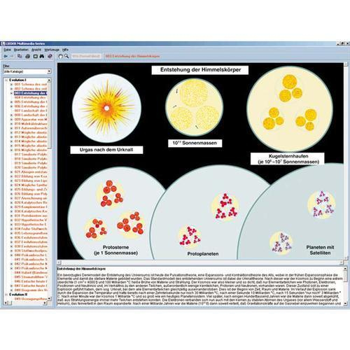 An unique CD of life-science. Evolution's road from "no-life" to life - stellar, chemical and organic evolution. Temporal course of evolution. Formation of celestial bodies and rise of chemical elements. Apparition of prokaryotes. Abiotic synthesis of amino acids, oligopeptides, polypeptides, purine and pyrimidine bases and nucleic acid sequences. Polynucleotide aggregates. Evolutionary stages of metabolism: fermenting, breathing, photosynthesizing prokaryotes. Primordial soup. Hypercycle according to EIGEN. Precambrian evidences of life. Evolution from prokaryotes to the plant and animal kingdoms. Spontaneous generation theories and findings. Phylogenetic schema for the five organic phyla. Endosymbiont hypothesis. Rise of multicellular organisms. Theory of gastraea, notoreunalia-gastroneuralia and coelom. Conquest of land. The saurians. Geological times. The "geologic clock". Foundations, mechanisms and course of the evolution of the plant and animal kingdoms. Evolutionary pointers. Morphological homologies. Bridging species. The Archaeopteryx. Evolution in terms of geography, ontogeny, biochemistry, and animal behavior. Parallel evolution. Biogenetic law according to HAECKEL. The theories of Lamarck and Darwin. Natural selection and selection induced by man. Isolation. Gene shift. Adaptive radiation. Continental drift. Principles of speciation. Ontogenetic spirals. Genetic landscape. Cultural development of man, evolution of languages. Tables of geologic formations. Recreation of prehistoric landscapes. Containing 513 pictures and text.