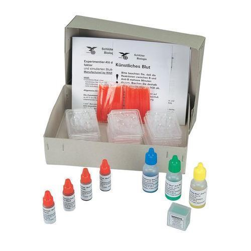 Supplied with: 4 dropper bottles of artificial blood (A, B, AB and 0), 1 dropper bottle each of artificial anti-A, anti-B and anti-Rh serum, 48 washable permanent test trays with 3 wells, 50 mixing sticks, detailed teacher's information with agglutination diagram.