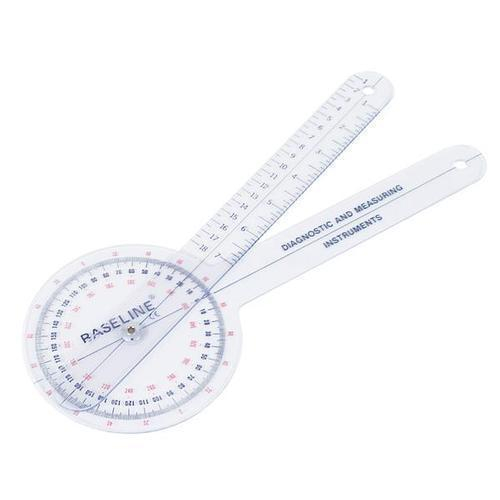 Clear plastic construction permits observation of joint axis of motion and range of motion with this Baseline goniometer. The 360° head has three scales calibrated for use with the ISOM (International Standards of measurement) system. The linear scales of this Baseline goniometer are displayed in inches and centimeters.