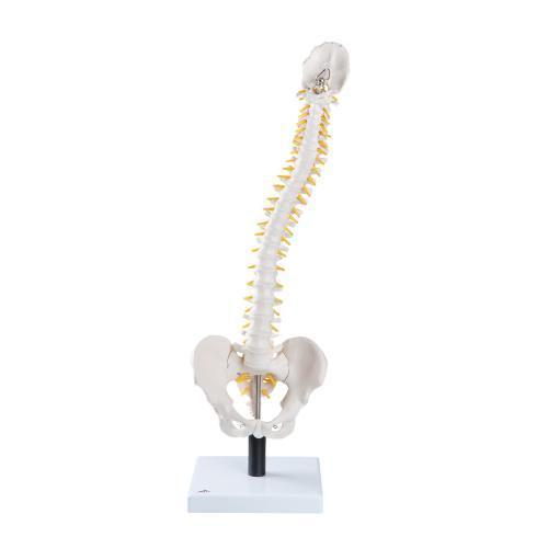 Soft discs add greater realism to this spine model! This unique spine shows how the discs deform during normal and abnormal positioning. Use it to demonstrate any number of pathological conditions of the spine such as scoliosis, lordosis, kyphosis, or subluxations. Herniation of the vertebral column can be demonstrated with compression. In addition, the special mounting allows unobstructed viewing during demonstration and display of the spine. This spine model includes spinal cord and spinal nerves. The spine comes with its own, removable stand.