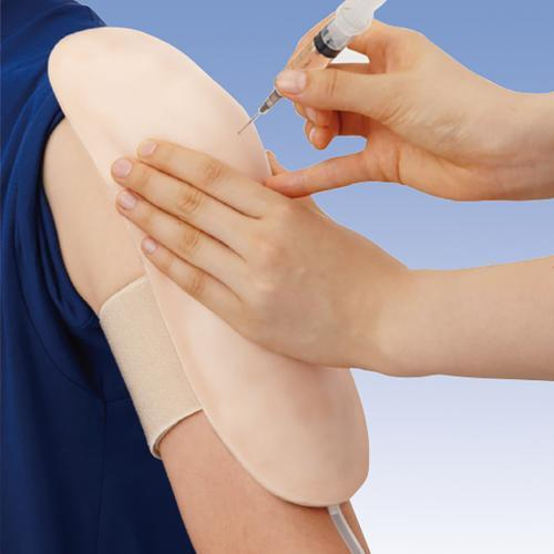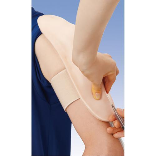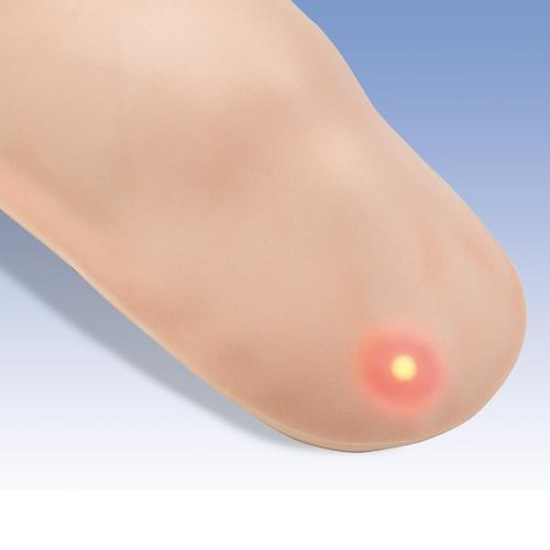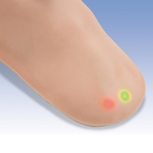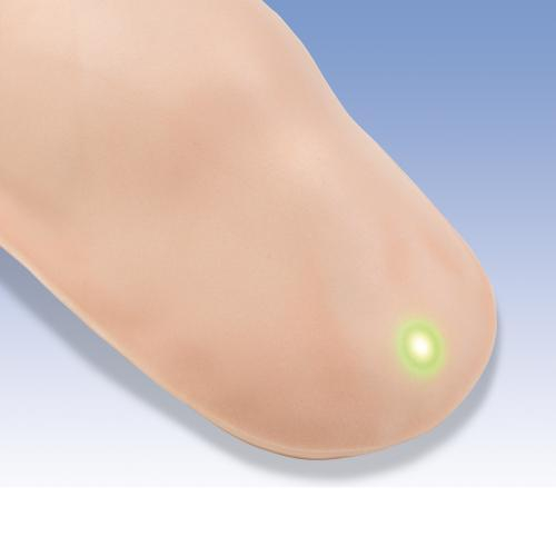 The student can use this injection simulator to practice both intramuscular and subcutaneous injections in the upper arm. The simulator can be attached easily using the stick-on tape. The student can find the injection site by feeling for the acromion. LED lights will show whether the injection has been inserted in the correct place to the right depth. The warning signal will sound if the injection is carried out incorrectly. Water only should be used for injecting. The delivery contents include the liquid pouch and the stick-on tape.