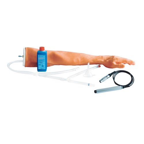 Arm Phantom Set. Model of a human arm for simulating Doppler sonographic examinations of blood vessels. Includes an ultrasonic Doppler Probe and so-calLed phantom fluid for simulating blood. The model features a variety of tubing (simulating blood vessels), including one tube which simulates a blood vessel stricture or stenosis. Using the ultrasonic Doppler apparatus (U10001) and a centrifugal pump (U10005), it is possible to simulate typical examinations used in vascular diagnosis. Doppler spectra are measured for the flow through arteries and veins with both a pulsing flow (like a heart beat) and continuous flow, allowing sounds typical of Doppler sonography to be heard. One particularly interesting feature is the possibility of observing the change in the spectra and the Doppler sound due a stenosis (stricture) in the elbow. In addition, it is possible to calculate the flow index and resistance index from the curves measured with a pulsing flow.