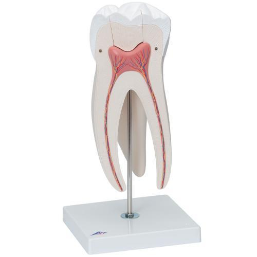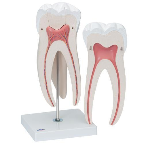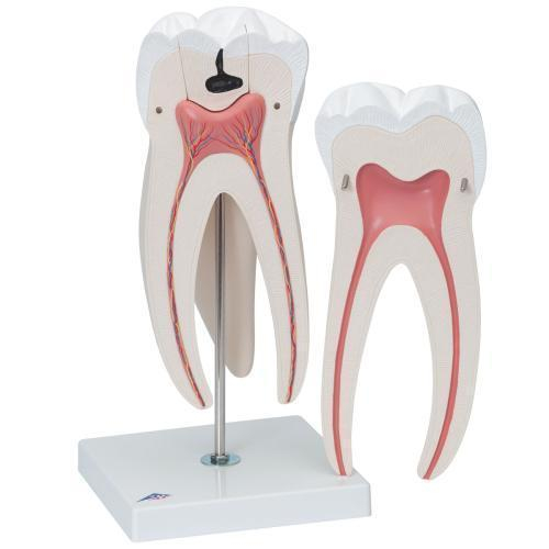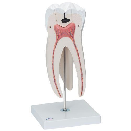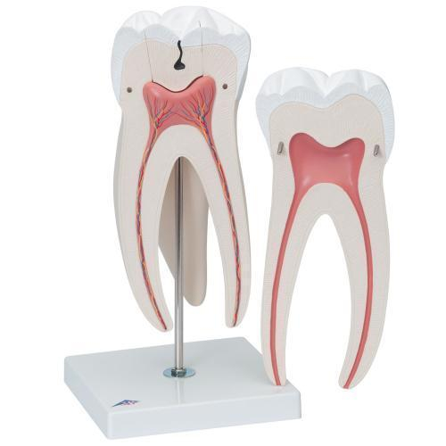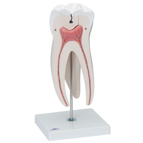 This giant molar model depicts an upper triple-root molar and separates into 5 parts. The molar features a longitudinal section through the crown, two roots and the pulp cavity. The giant molar contains removable pulp and three tooth inserts with different stages of advanced cavities. Giant molar with dental cavities on stand.