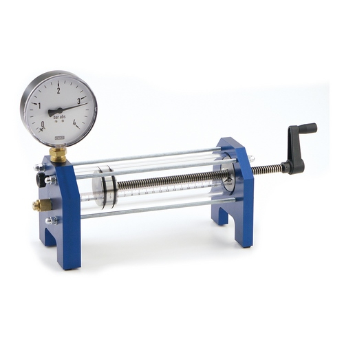 Boyle-Mariotte Apparatus. Apparatus for determining experimentally the relationship between gas volume and pressure at constant temperature. The working cylinder is made of transparent acrylic and has a moving piston, scale and manometer. Along with a valve to let in gas or release it. The movement of the piston is achieved with the help of a threaded connecting rod turned by means of a manual crank. In this way, pressure both above and below atmospheric can be generated. For safety reasons, the working cylinder is enclosed in another Protective transparent acrylic cylinder.