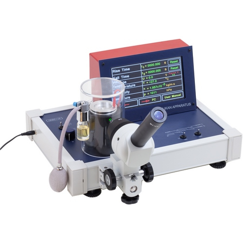 Millikan's Apparatus (115 V, 50/60 Hz). Compact apparatus for demonstrating the discrete nature (quantisation) of electric charge and for determining the elementary charge of an electron. Comprising an experiment chamber kit for assembly with plate capacitor and connected oil atomiser, lighting unit with two green Leds, measuring microscope, voltage adjustment knob and switch to set the capacitor voltage, switch for starting and stopping rise and fall time measurements and a display unit with touch screen. Measurements can be made using the floating method or the rising and falling method. Measured rise and fall times for a charged droplet of oil are displayed on the touch screen along with the configured voltage. Parameters relevant to the evaluation of the results, temperature, viscosity and pressure are also displayed. Includes plug-in power supply, 12 VAC, 1 A.