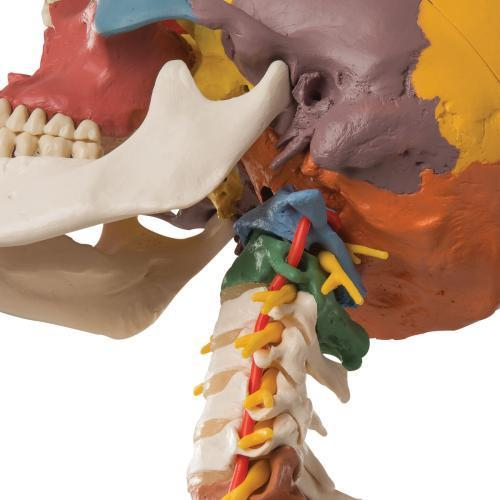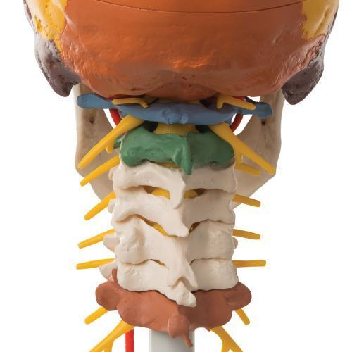 Having been cast from an original human skull, this model shows an absolute accurate representation of the fissures, foramina, processes and sutures. In addition, this human skull replica is flexibly mounted on the cervical spine (C1, C2 and C7 are colored) to better show their relation. To complete this demonstration, the didactic model also exhibits the hindbrain, spinal cord, spinal nerves of the cervical spine, vertebral arteries, basilar artery as well as the rear cerebral arteries.