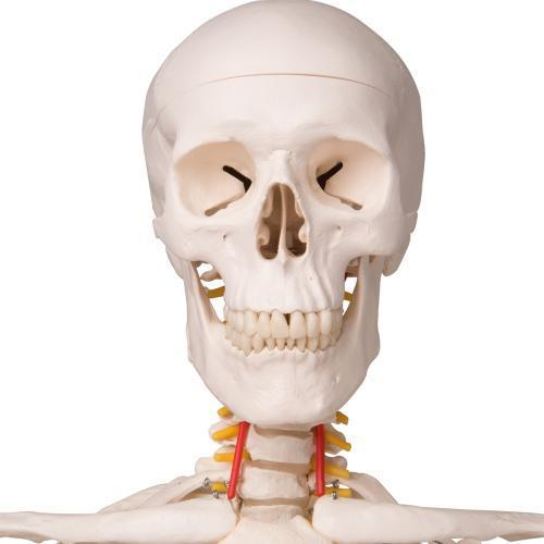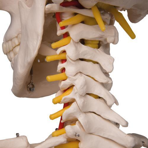 Fred offers all the advantages of a 3B Scientific skeleton. Fred's bendy spine can copy almost any human movement too.. Once bent, Fred will remain in that position, to show correct and incorrect postures as well as any pathological malalignments. All skull movements can be shown on the head joints. Protruding spinal nerves and vertebral arteries are also shown on this skeleton, as well as a dorsolateral slipped disc between the 3rd and 4th lumbar vertebrae.