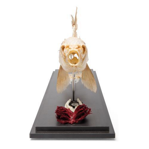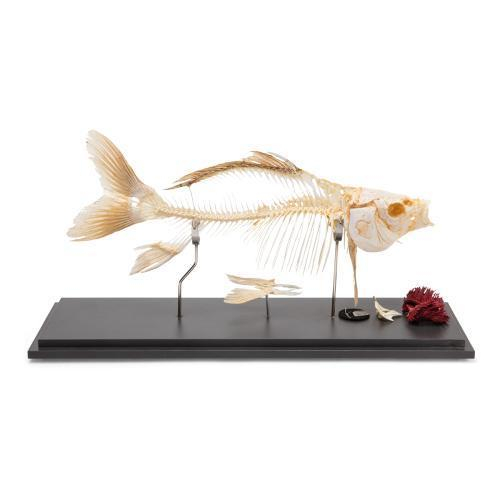 Complete, real skeleton of a carp, carefully prepared, reassembled and mounted on a base plate. It represents a typical example of the order of cypriniformes. The specimen is particularly suitable for the study of the structure of bony fish. The following typical features of bony fish are mounted separately:
