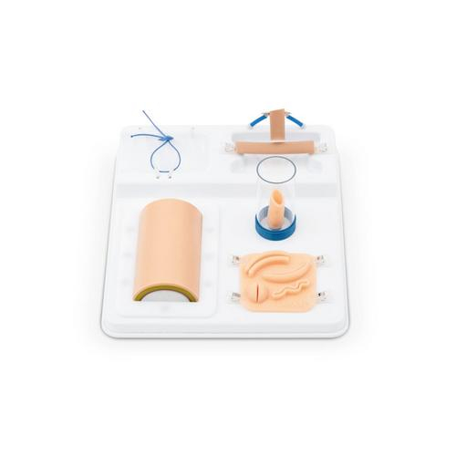 This suturing technique trainer is designed for use both by medical students and surgeons to enhance familiarity and expertise of a wide range of suturing techniques. The training set includes five different training modules and a full set of instruments, accessories, and pads.