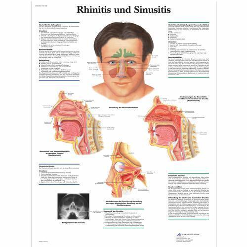 This colorful anatomical chart provides information about Rhinitis and Sinusitis. Cause, effect, and anatomy of rhinitis and sinusitis are covered in this poster. Printed on premium glossy (200g) paper. Convenient Poster size 50 x 67 cm (20 x 26"). Language: German