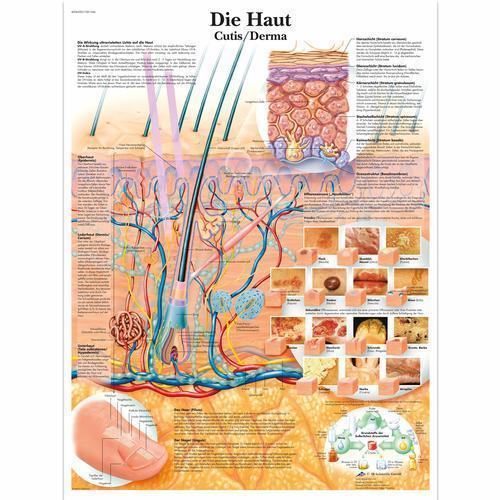 The skin anatomy chart is printed on premium glossy (200g) paper. Convenient Poster size 50 x 67 cm (20 x 26"). Language: German