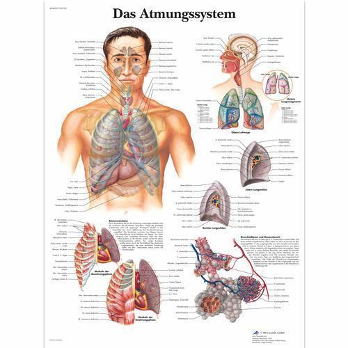This colorful anatomical chart details the anatomy of the human respiratory system. All aspects of the respiratory system are covered on this poster. Printed on premium glossy (200g) paper. Convenient Poster size 50 x 67 cm (20 x 26"). Language: German