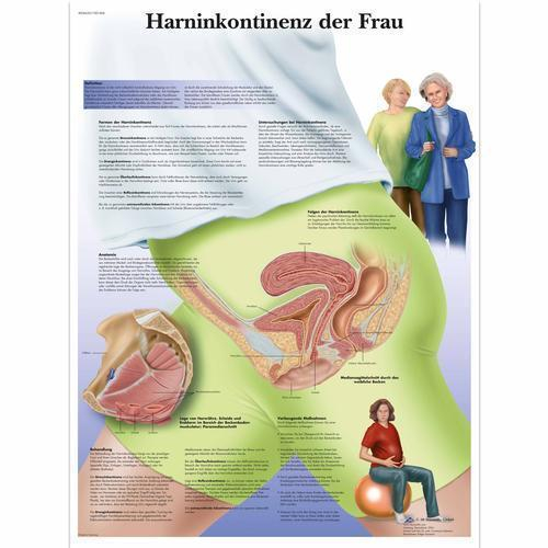 This high quality, colorful anatomical chart details female urinary incontinence. The affected anatomy of urinary incontinence is illustrated along with important information about causes, treatments, and prevention. This anatomy poster is a great educational tool for human female urinary incontinence. Printed on premium glossy (200g) paper. Convenient Poster size 50 x 67 cm (20 x 26").